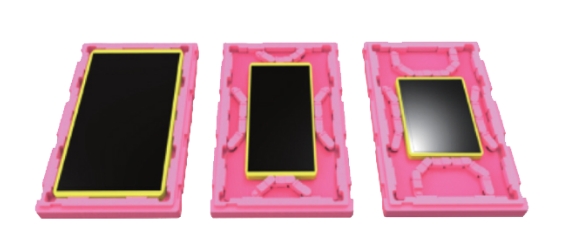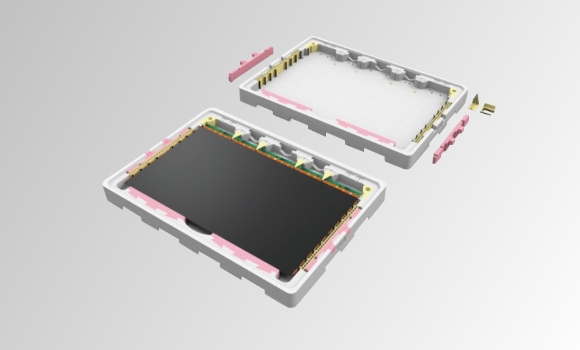 TFT-LCD 面板尺寸多样化是不可避免的趋势,也因此导致停产机种产生大量闲置玻璃运输箱,“移动式档块设计”于箱底及箱盖预留固定卡槽,让档块可垂直和水平移动以调整装片尺寸,即使产品停产后也能藉改变文件块位置再给其他新机种使用,可达成运输箱重复使用并减少新模具开发费用; 且档块是由两种发泡倍率堆栈,低倍率用以固定文件块位置, 高倍率则提供缓冲用以提升保护性;档块可藉由箱底及箱盖卡槽固定于任意位置,不需多余料件支撑于墙面可节省材料成本,甚至可依需求装载不同尺寸面板以增加共享性, 减少新包材的开发。
