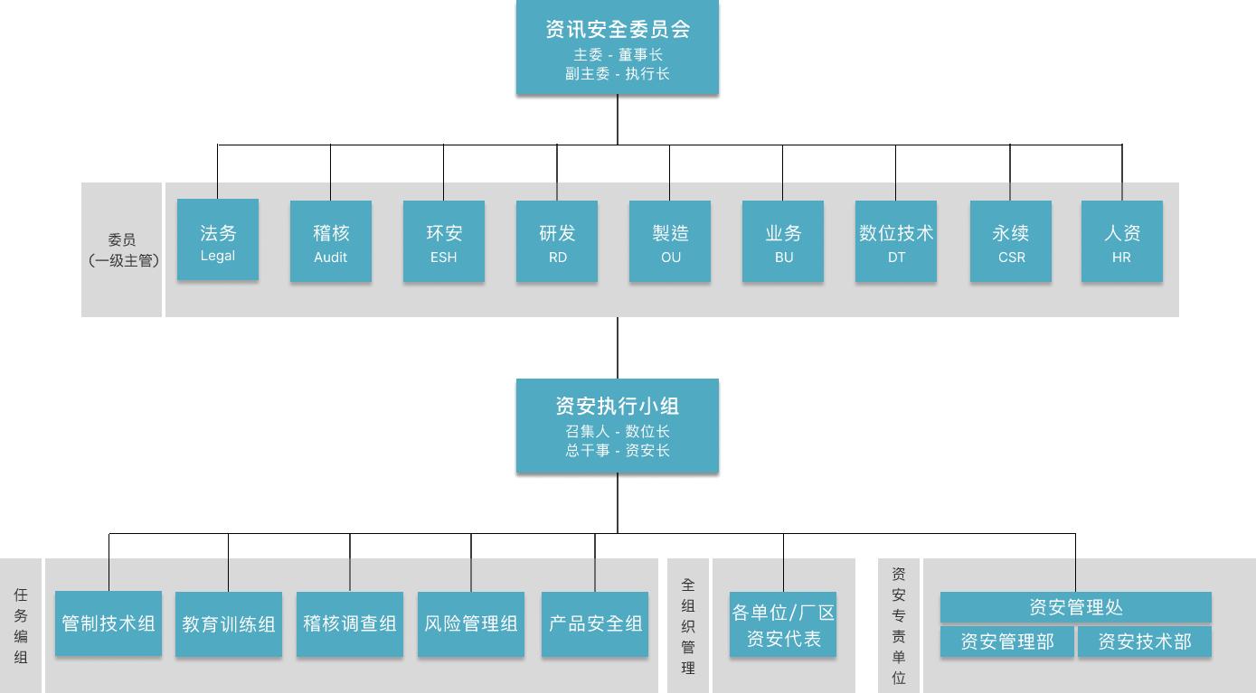 资讯安全委员会为haobotiyu-好博(中国)资安最高管理组织,向董事长报告。下辖资安执行小组负责推行资讯安全委员会之各项决议。为持续建构完整且精实的资安专 责团队,资讯安全管理处下成立「资讯安全管理部」与「资讯安全技术部」,持续投入资源以强化团队资安核心能力。