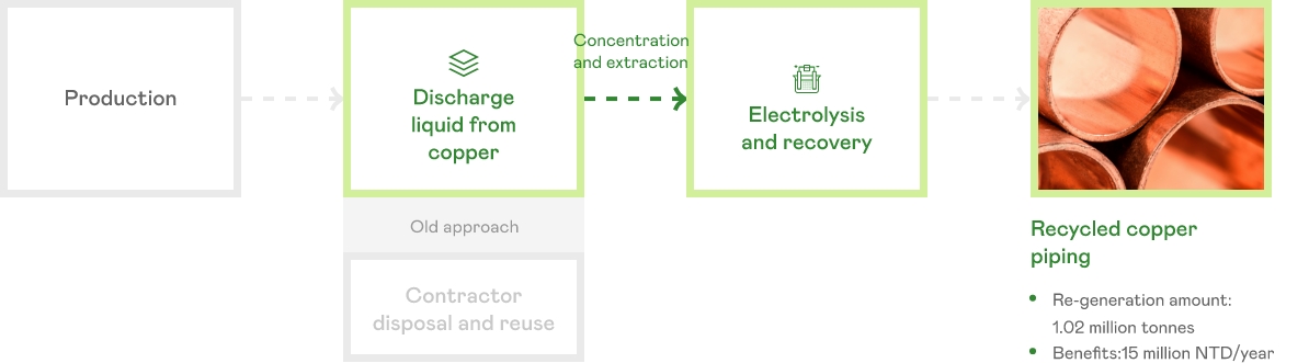 • Waste liquid containing copper from the etching process is processed using electrolysis into high-purity copper piping for use in other industrial applications.